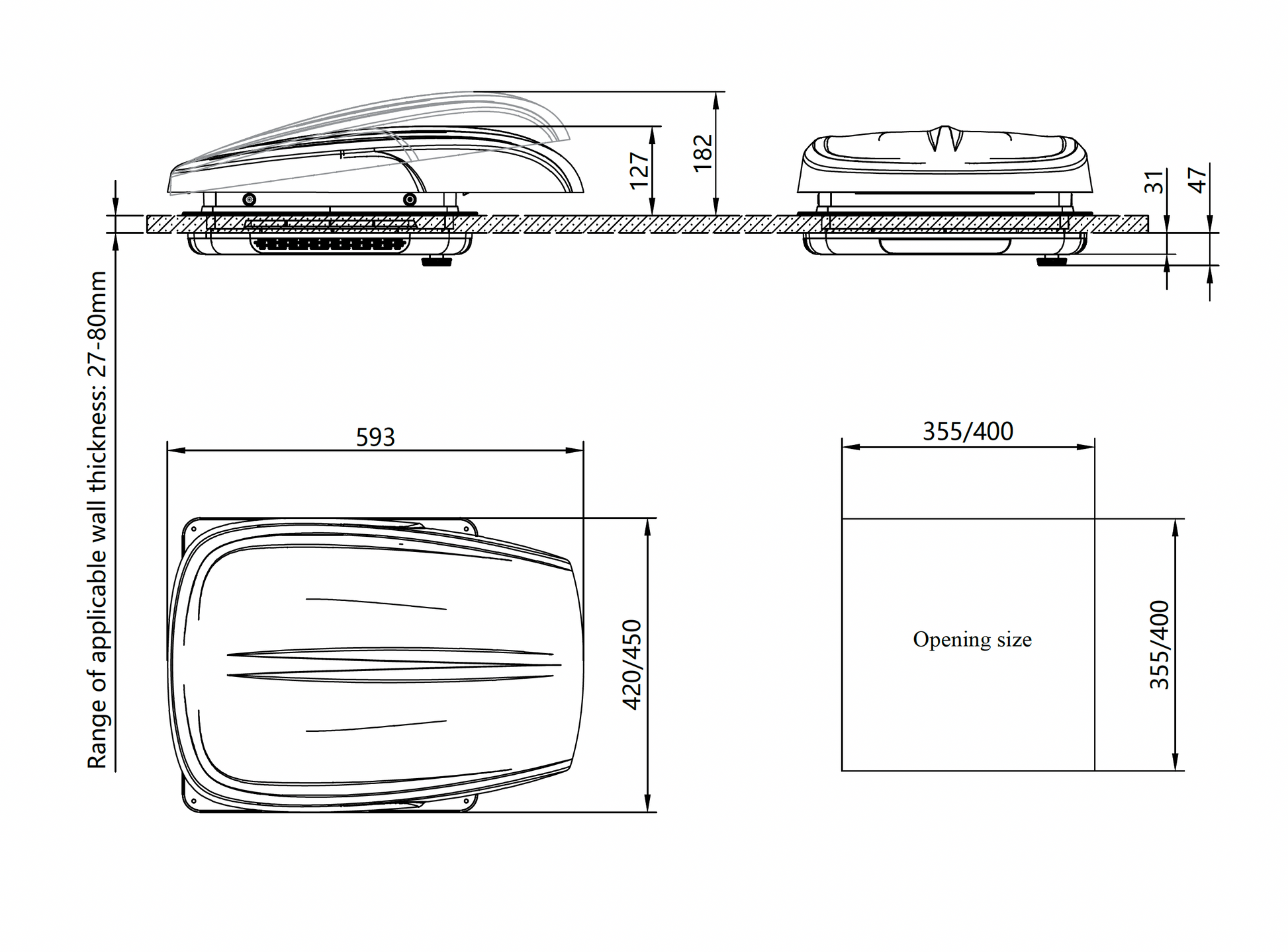 - External Dimensions: 593 × 420/450 × 182 mm (open) / 593 × 420/450 × 127 mm (closed)